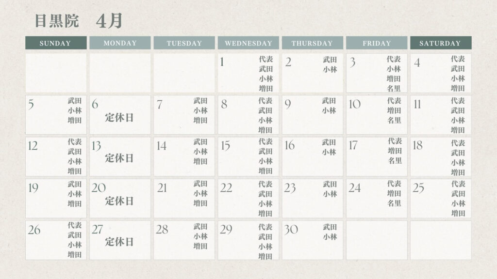 【4月出勤スタッフカレンダー】目黒本院